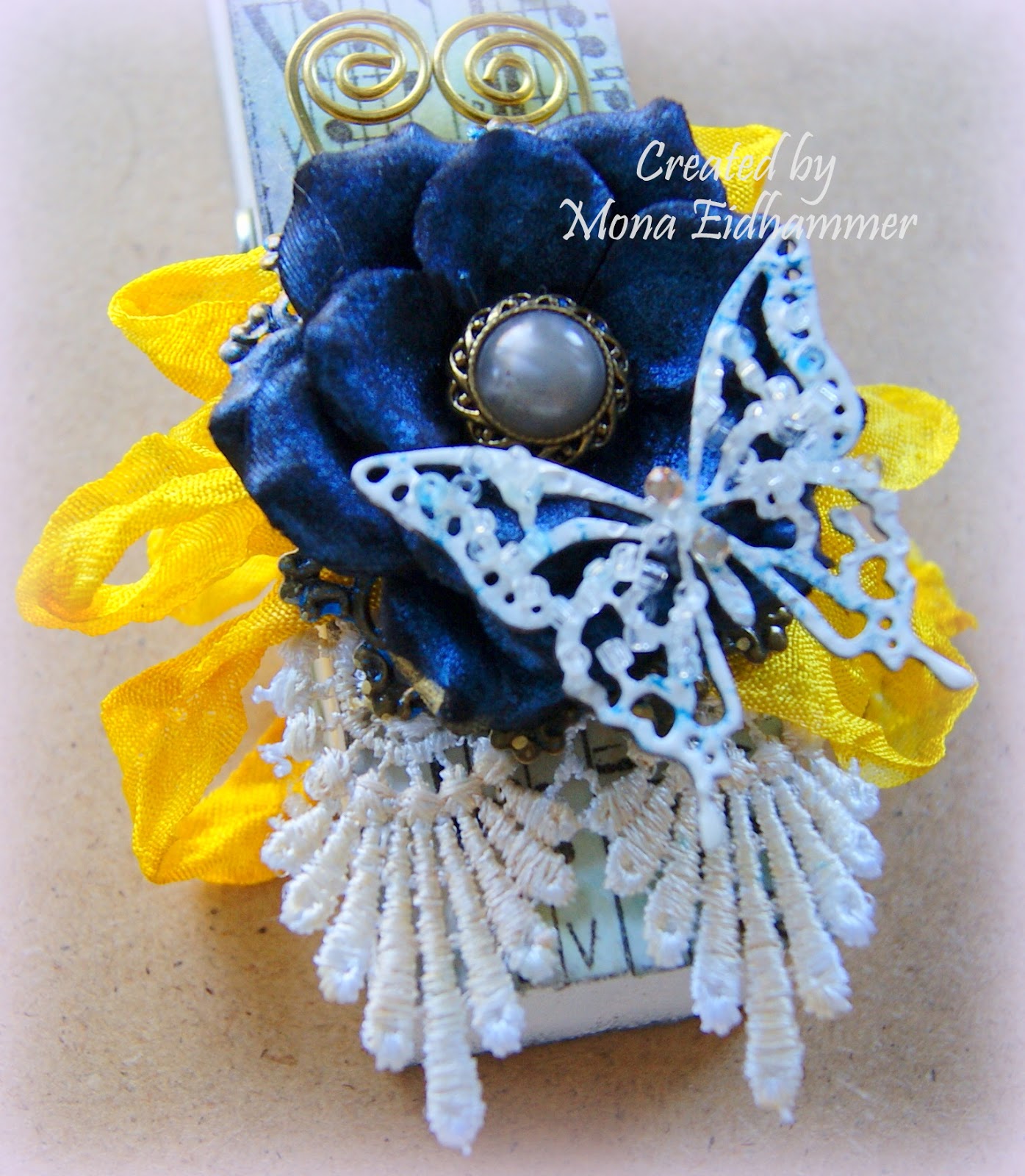 This Resin rose element from Prima was a bit ruined but i figured i could still use it. I painted the middle of the big flower (Meredith dove from Prima) to get rid of the "wrong" colour and gave the big rose (Arcadian coll. from Prima) some stickles diamond glitter. The memories element is also from Prima.